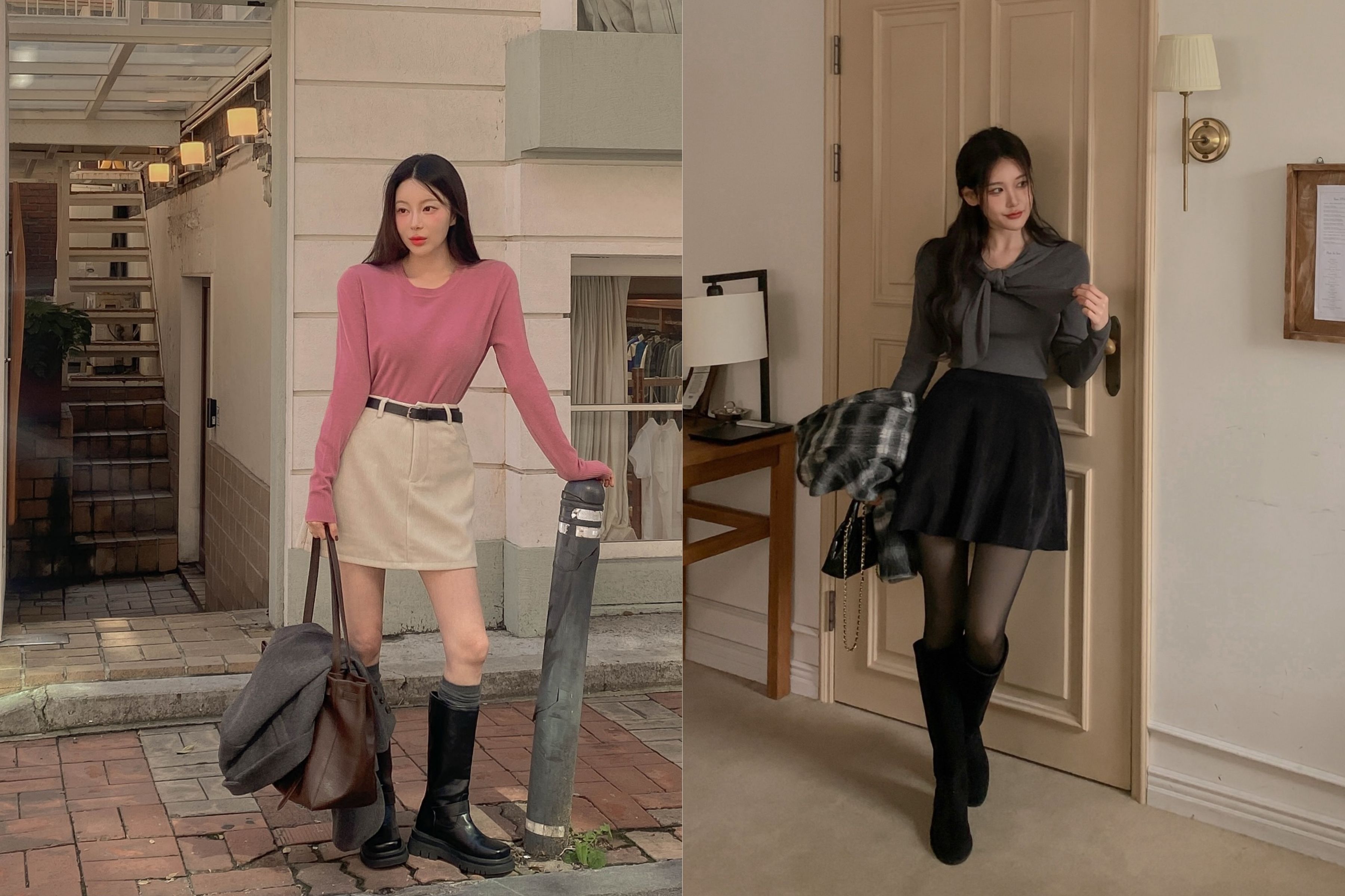 Đây là công thức "hack tuổi" và "hack dáng" bất bại. Một chiếc áo thun dài tay, có thể là áo trơn hoặc họa tiết graphic, sơ vin gọn gàng cùng một chiếc chân váy mini (chân váy xếp ly, chân váy da). Bản phối này mang đậm tinh thần "school girl" nổi loạn, vừa ngọt ngào, vừa cá tính. Hoàn thiện set đồ bằng một đôi boots hoặc loafers đế dày.