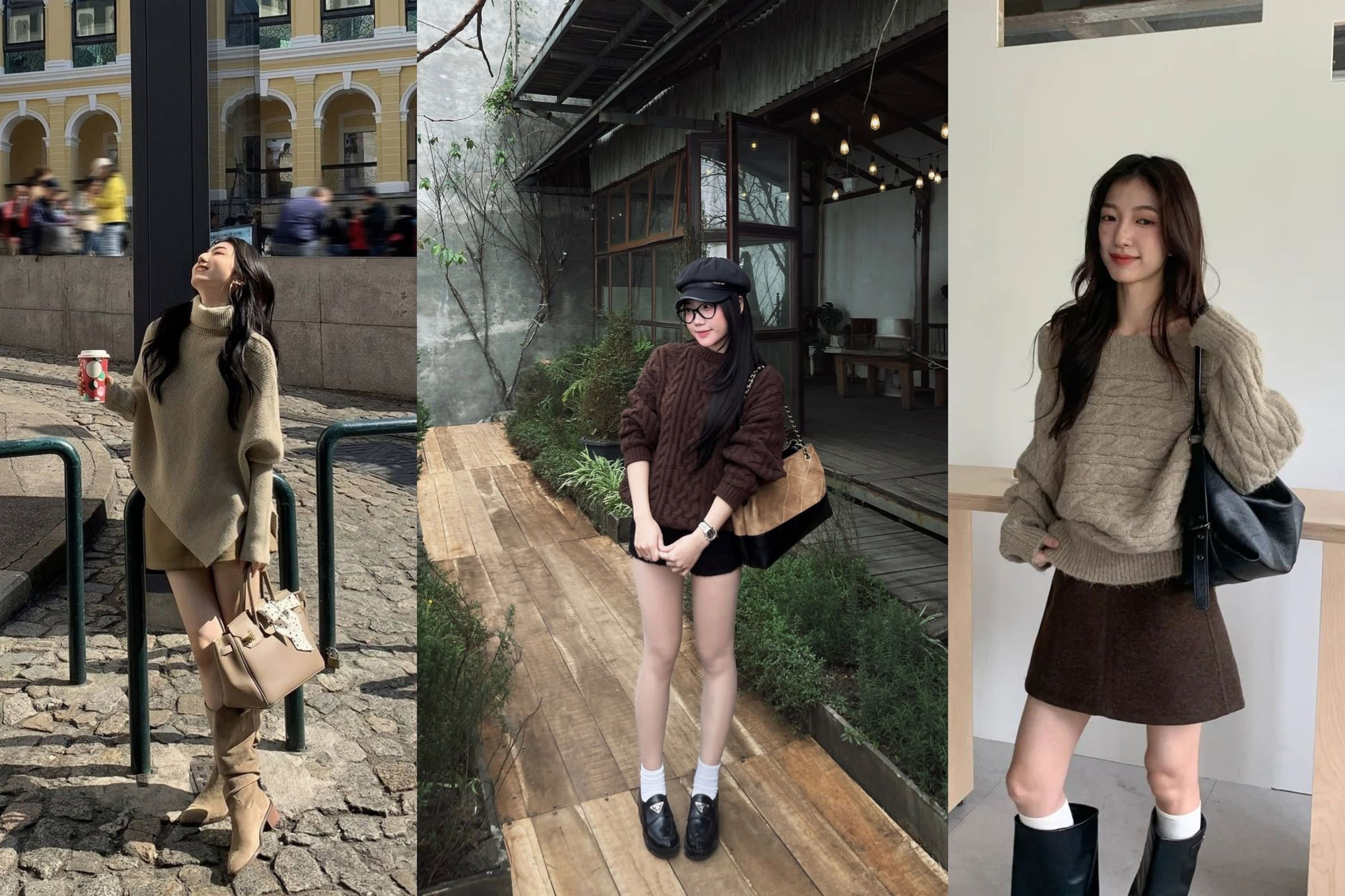 Đây là công thức "trên rộng, dưới ngắn" bất bại, mang đậm tinh thần preppy-chic. Một chiếc áo len oversized, phối cùng một chiếc chân váy (chân váy da, chân váy xếp ly, hoặc chân váy tweed). Bản phối này không chỉ "hack" dáng đỉnh cao mà còn tạo ra một vẻ ngoài vừa ngọt ngào, vừa cá tính. Hoàn thiện set đồ bằng một đôi boots cao cổ hoặc loafers đế dày.