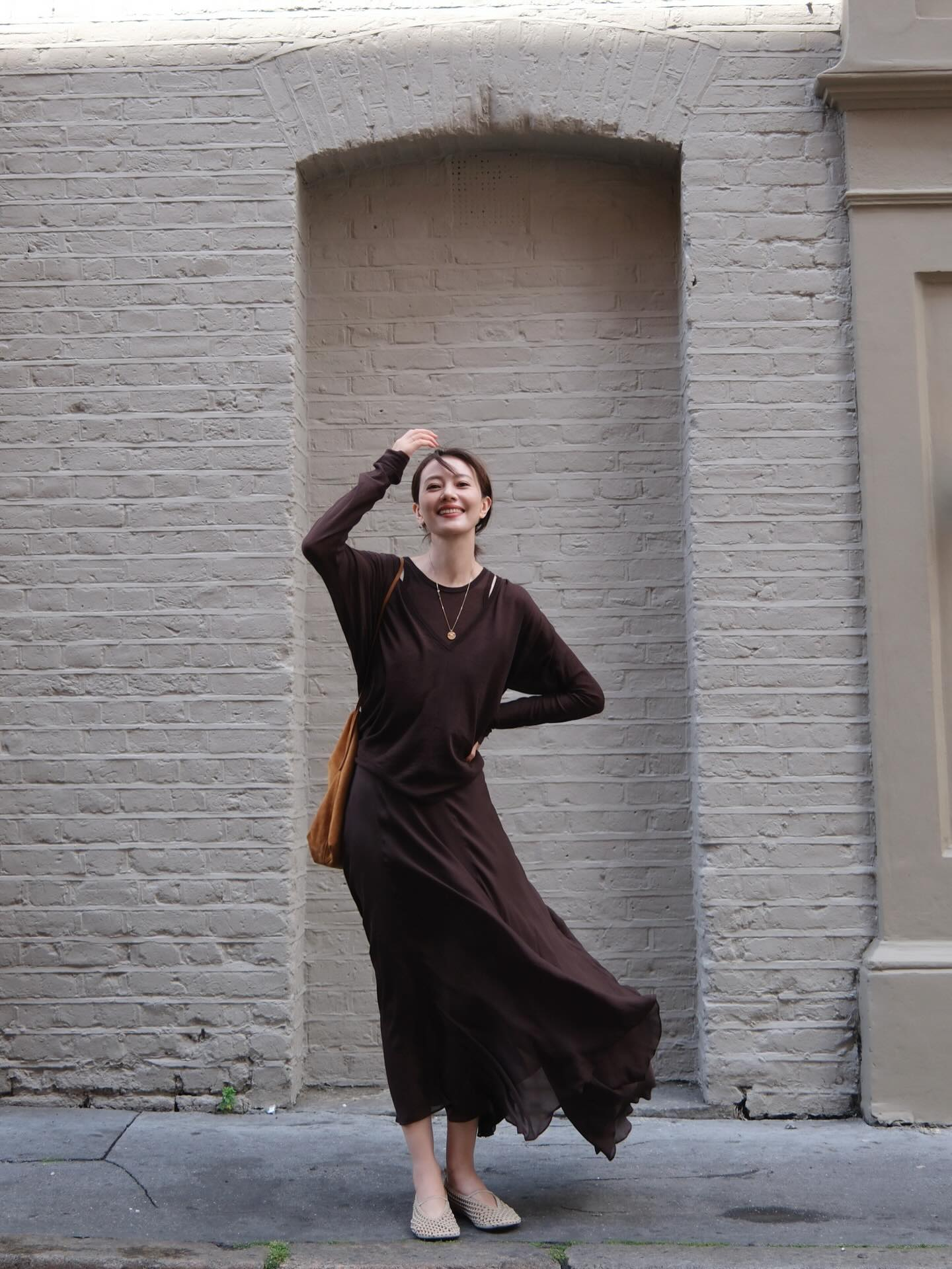 Màu nâu đang là gam màu "ruột" của giới sành điệu, và Cao Viên Viên là một bậc thầy. Một set đồ "all-brown" gồm áo len mỏng và chân váy sẽ ngay lập tức mang lại vẻ ngoài "đắt giá" một cách tự nhiên. Bí quyết của cô là chọn những item có phom dáng hiện đại như chân váy bất đối xứng và tạo điểm nhấn bằng một đôi giày ballet ngọt ngào.