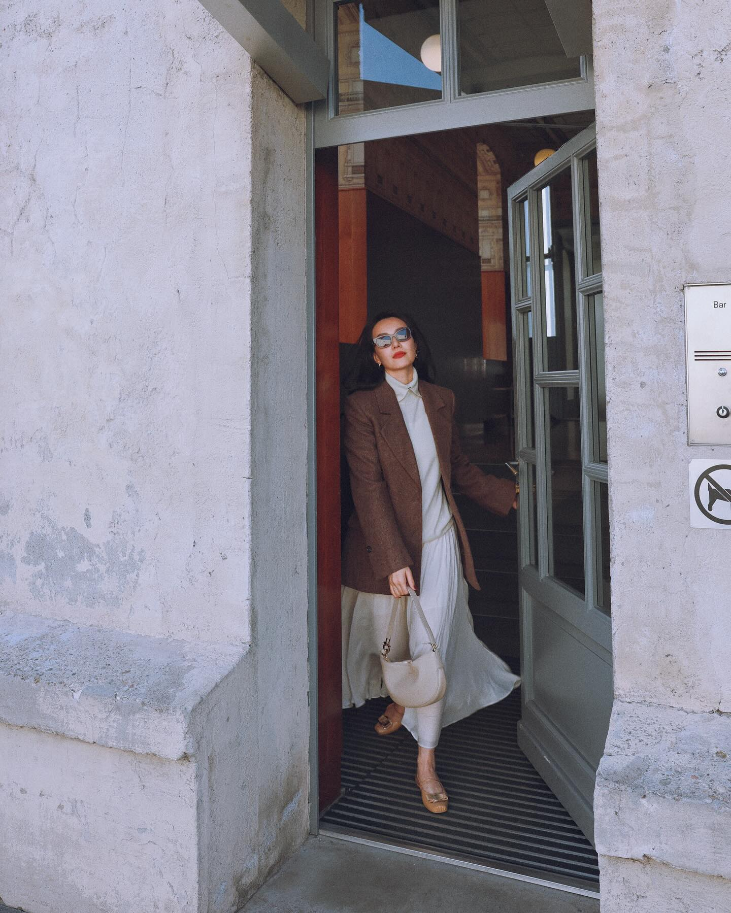 Công thức này là đỉnh cao của sự tinh tế. Một set đồ trắng toàn tập gồm áo và chân váy, được khoác ngoài bởi một chiếc blazer màu nâu trầm ấm. Sự kết hợp giữa nền trắng tinh khôi và điểm nhấn màu nâu tạo ra một tổng thể vừa tươi trẻ, vừa có chiều sâu và cực kỳ sang trọng.