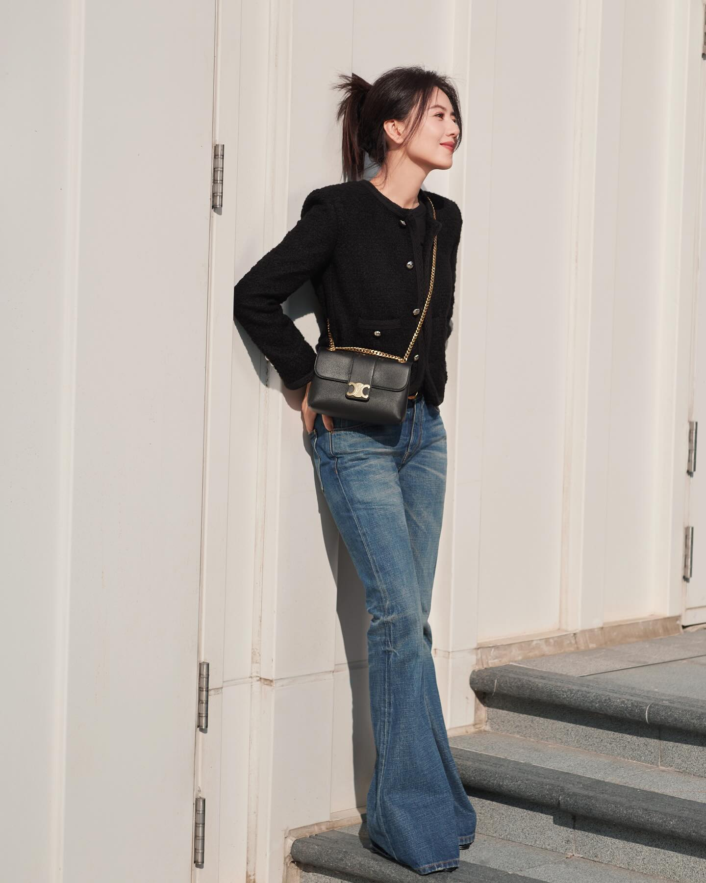 Quên đi skinny jeans, quần ống loe mới là item "quyền lực". Phom dáng phảng phất nét cổ điển của thập niên 70 này không chỉ giúp "kéo dài" đôi chân mà còn mang lại vẻ sang chảnh tức thì. Hãy học Cao Viên Viên kết hợp nó cùng một chiếc áo có thiết kế tinh xảo và một đôi giày cao gót để có một vẻ ngoài đẳng cấp.