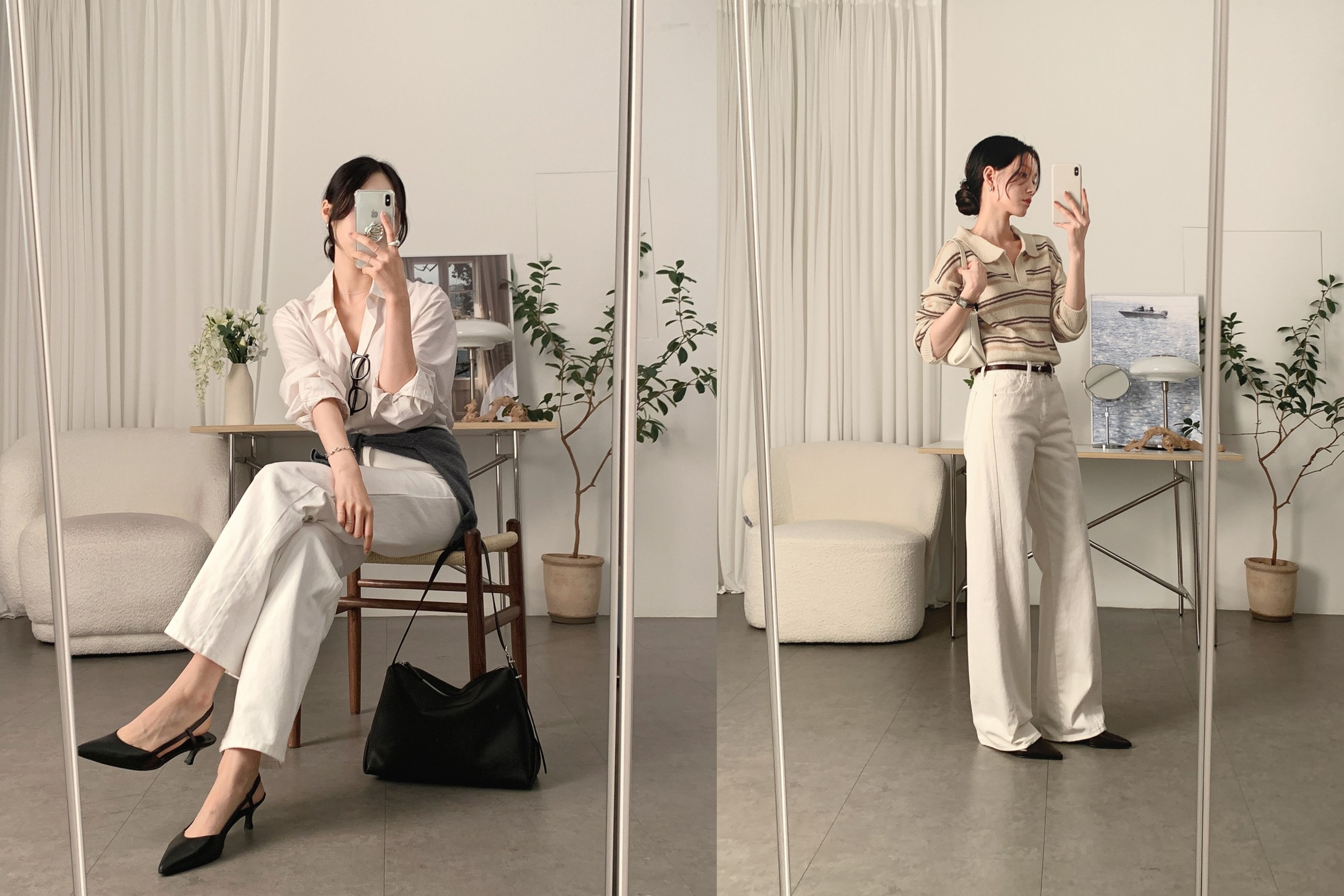 Sự kết hợp giữa Áo sáng màu và Quần trắng (White Pants) là đỉnh cao của sự tinh tế. Áo màu Hồng Đào, Xanh Mint trên nền quần trắng tạo nên độ tương phản nhẹ nhàng, sang trọng.