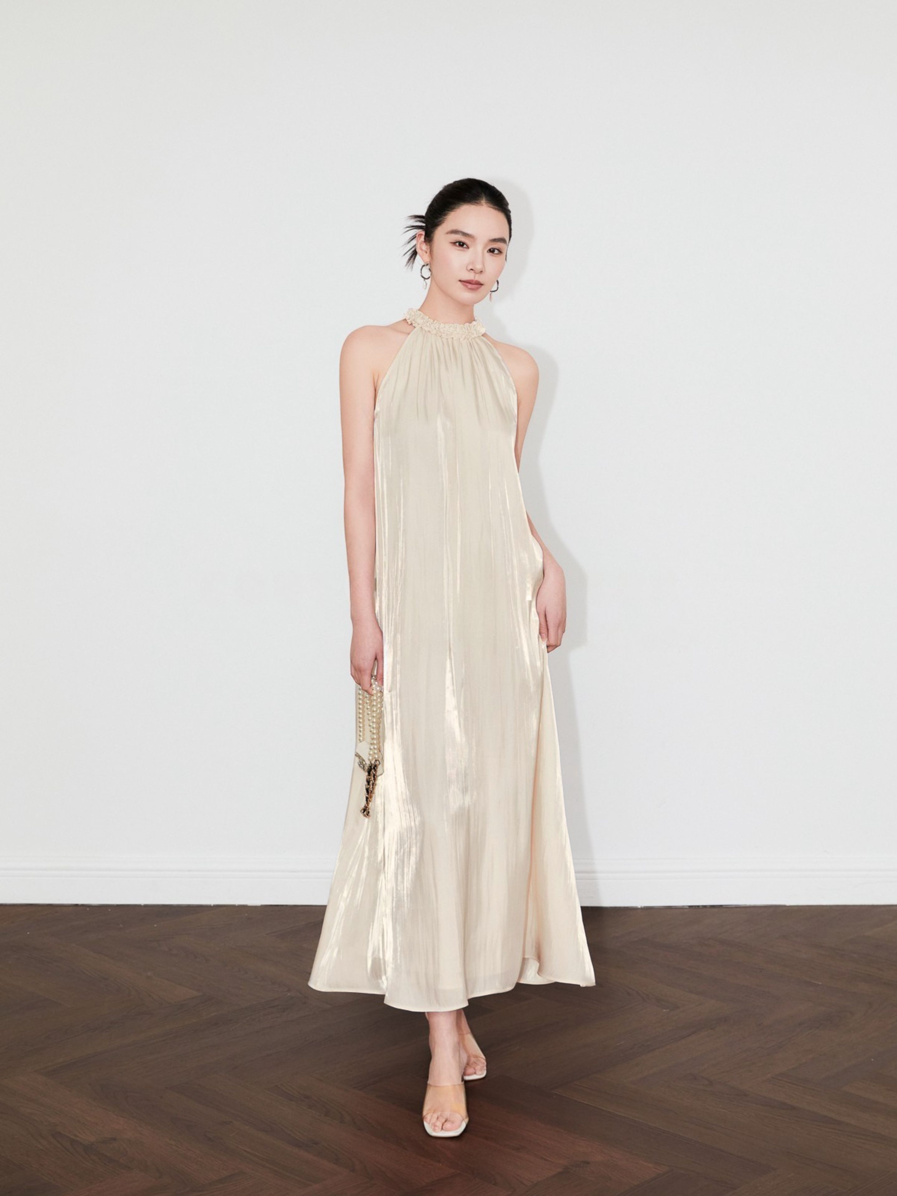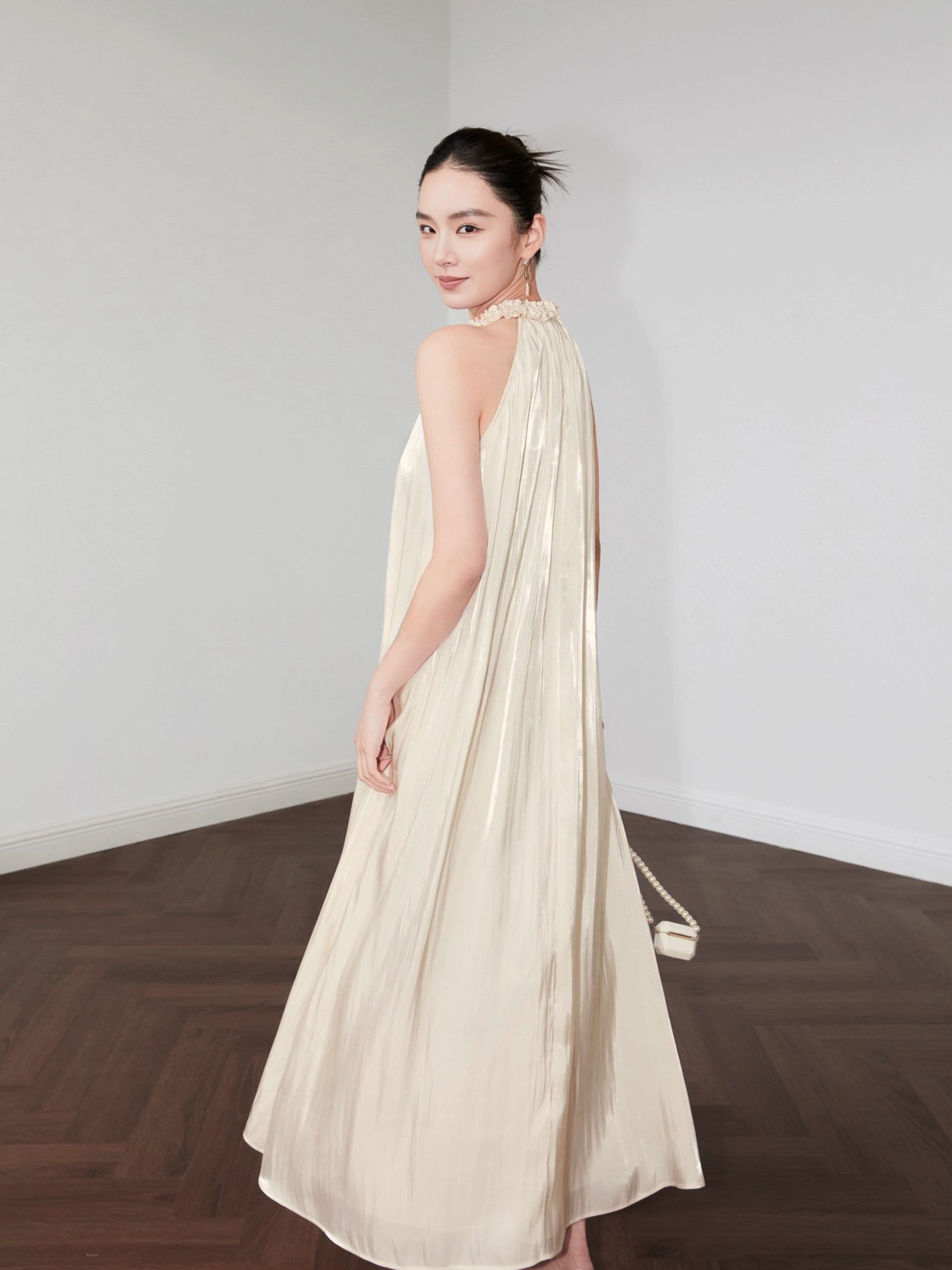 Linh hồn của thiết kế nằm ở phom dáng cổ yếm (halter neck) kinh điển, được làm mới bằng chi tiết xếp nhún bồng bềnh tựa như những cánh hoa Iris đang hé nở. Chi tiết đắt giá này vừa là một điểm nhấn nữ tính, vừa khéo léo tôn vinh bờ vai thanh thoát và phần lưng trần gợi cảm một cách đầy ý nhị. Từ phần cổ, dáng đầm buông rủ tự do theo một đường cong A-line mềm mại, mang lại sự thoải mái tuyệt đối và một dáng vẻ uyển chuyển, thướt tha trong từng bước đi.