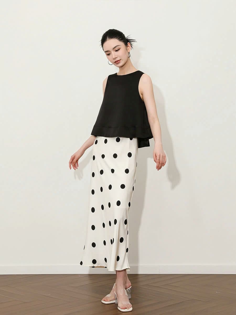 Váy dài cổ bẻ chất vải xốp nhăn điểm họa tiết chấm bi trắng nền đen là sự kết hợp của nhiều yếu tố cổ điển - sự tương phản của màu sắc, họa tiết trendy và dáng váy chữ A linh hoạt