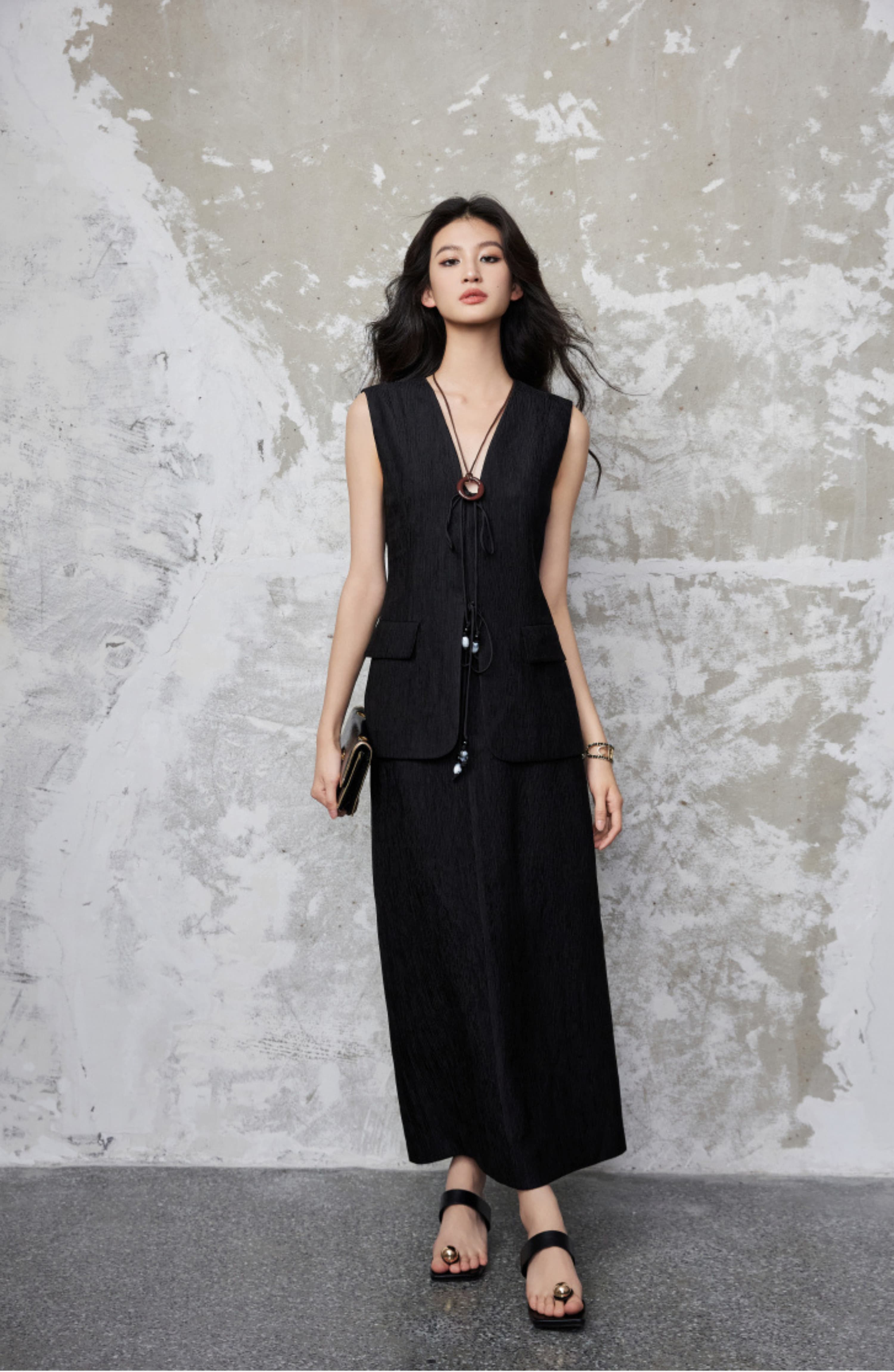 Thiết kế áo vest mang dáng dấp của trend coat mang đến hình ảnh khác lạ, ấn tượng cho bản phối gam màu xám