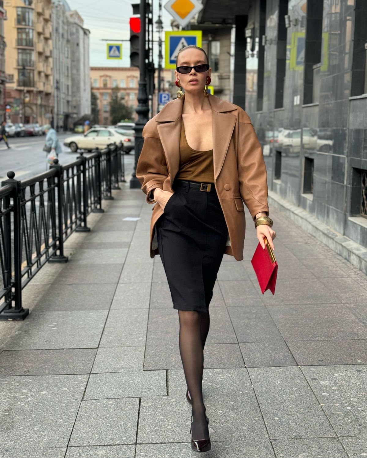 Đường cắt sâu chữ U khoe trọn xương quai xanh (Collarbone) thanh tú, mang lại nét quyến rũ ý nhị. Sự tương phản giữa phần dưới ôm sát, đứng phom và phần trên mềm mại, gợi cảm tạo nên một diện mạo "Executive Elegance" (Nữ lãnh đạo đài các). Hoàn thiện với giày cao gót mũi nhọn (Pointed Pumps) và Clutch cầm tay.