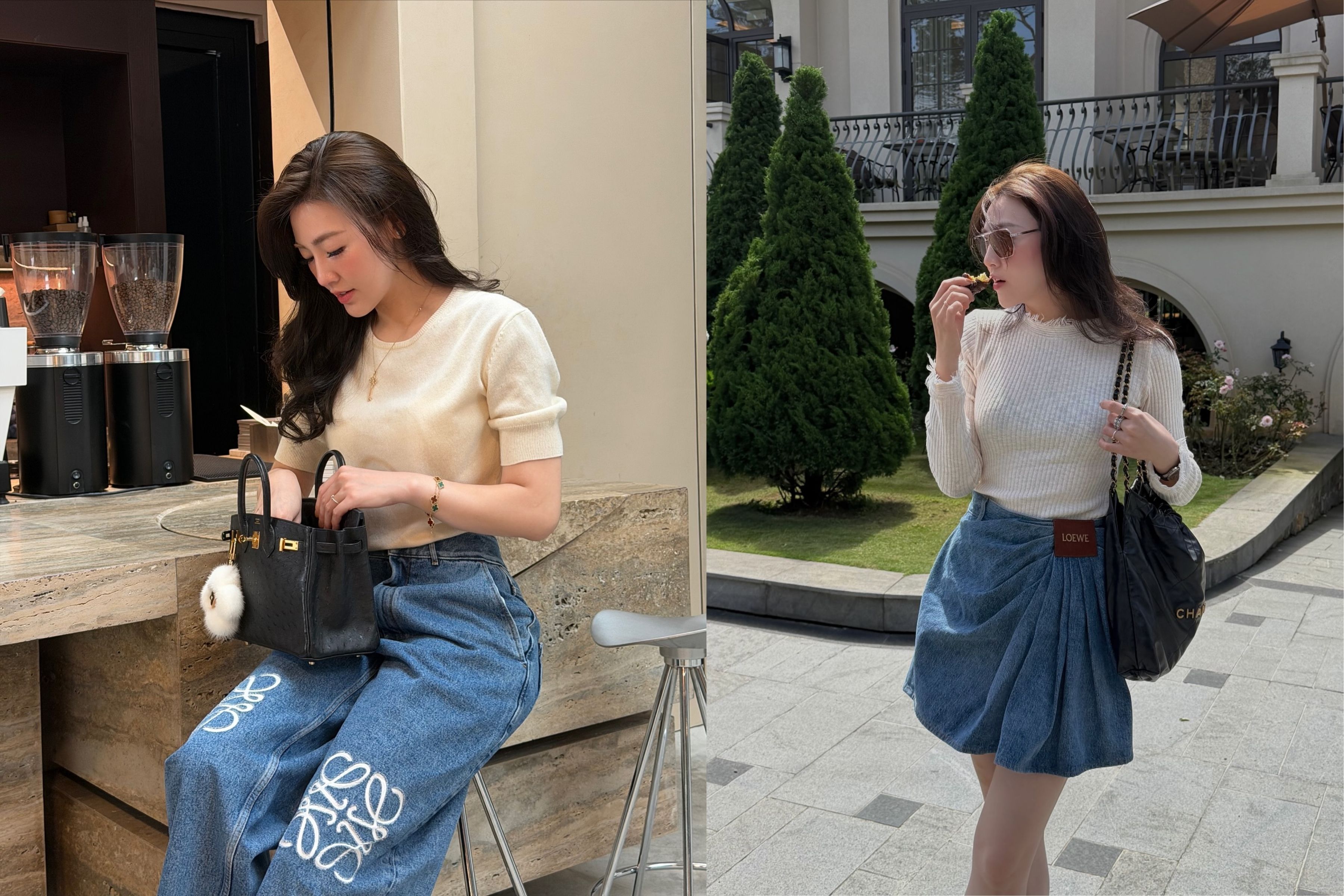Cô thường kết hợp áo len trắng với Denim cao cấp để tạo nên phong cách Casual-Luxe (Sang trọng đời thường). Sự tương phản giữa len mềm và jeans cứng cáp mang lại vẻ ngoài trẻ trung, năng động nhưng vẫn giữ được cốt cách thanh tao.