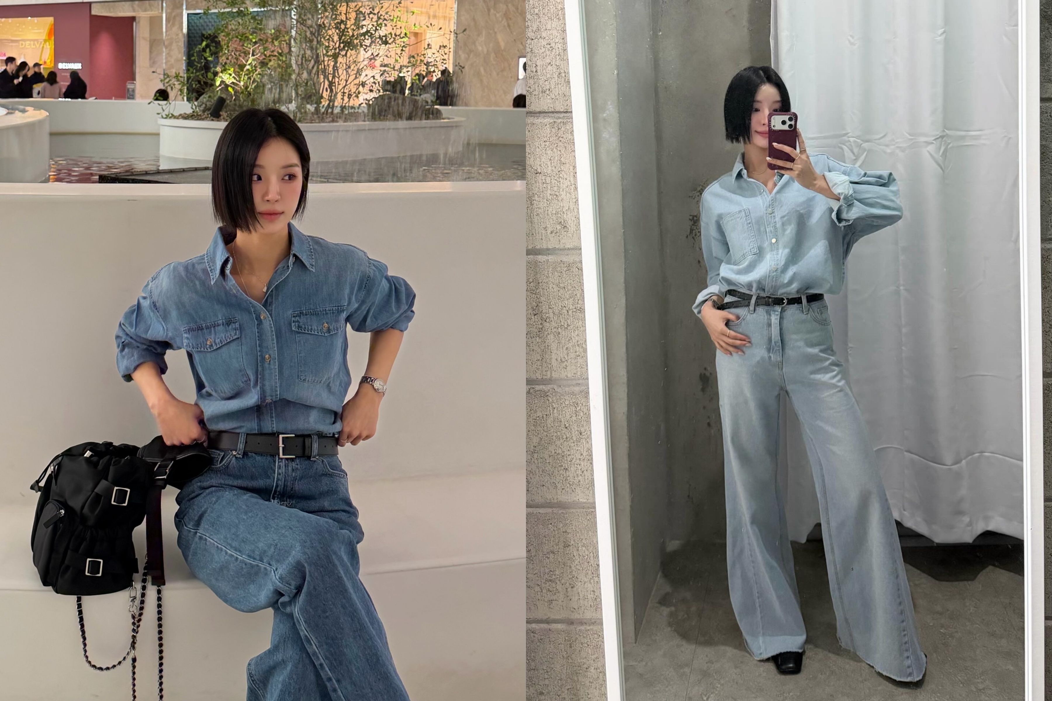 "Denim on Denim" không chỉ dành cho phong cách đường phố (Streetwear). Khi được xử lý trên những chất liệu Denim cao cấp (Premium Denim) mỏng nhẹ, bản phối này trở thành tuyên ngôn của sự tự do đầy kiêu hãnh.