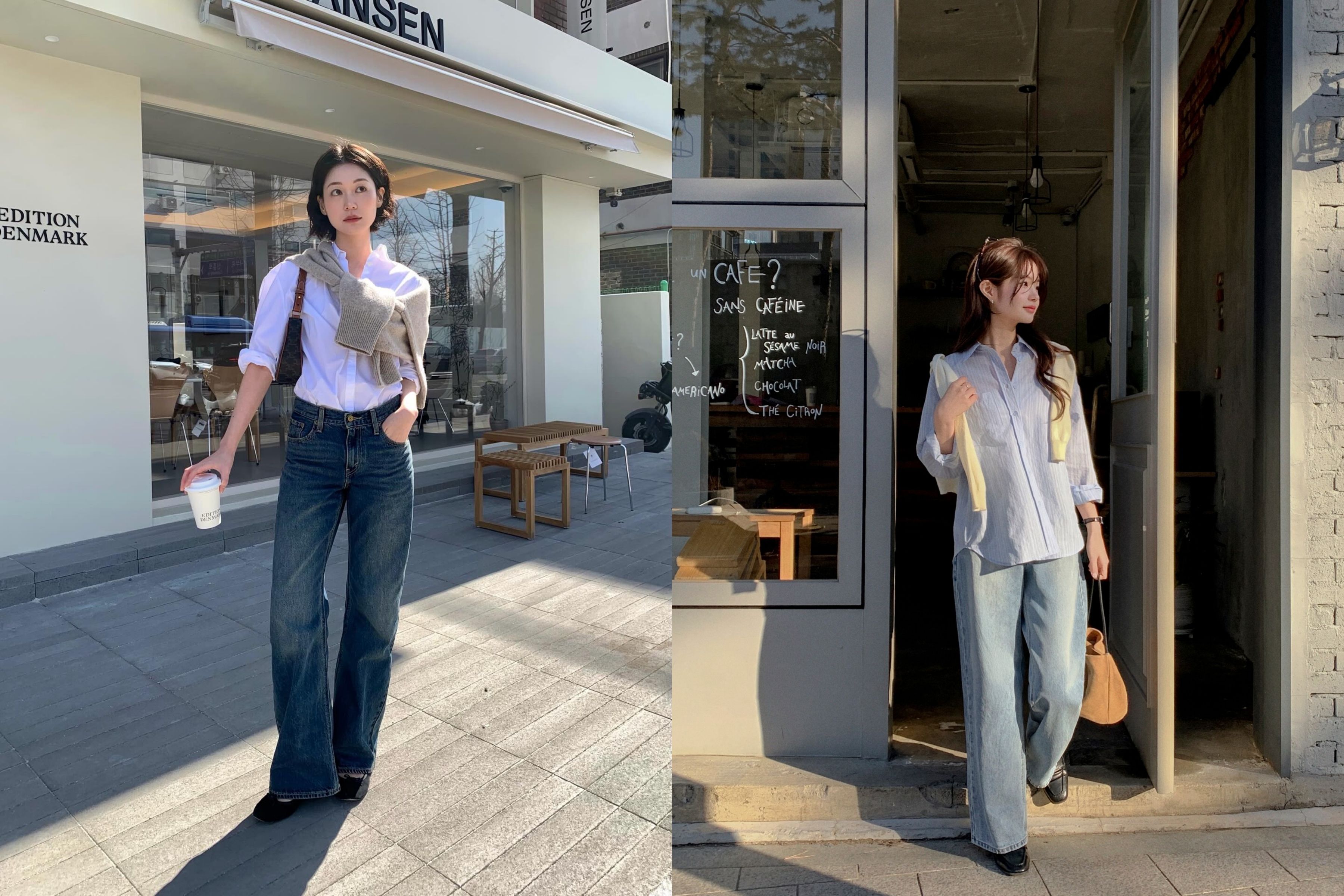 Sơ mi basic (Classic Shirt) và Quần Jeans suông (Wide-leg Jeans) là bộ đôi vượt thời gian. Sự đẳng cấp của bản phối này nằm ở chất lượng của từng item.
