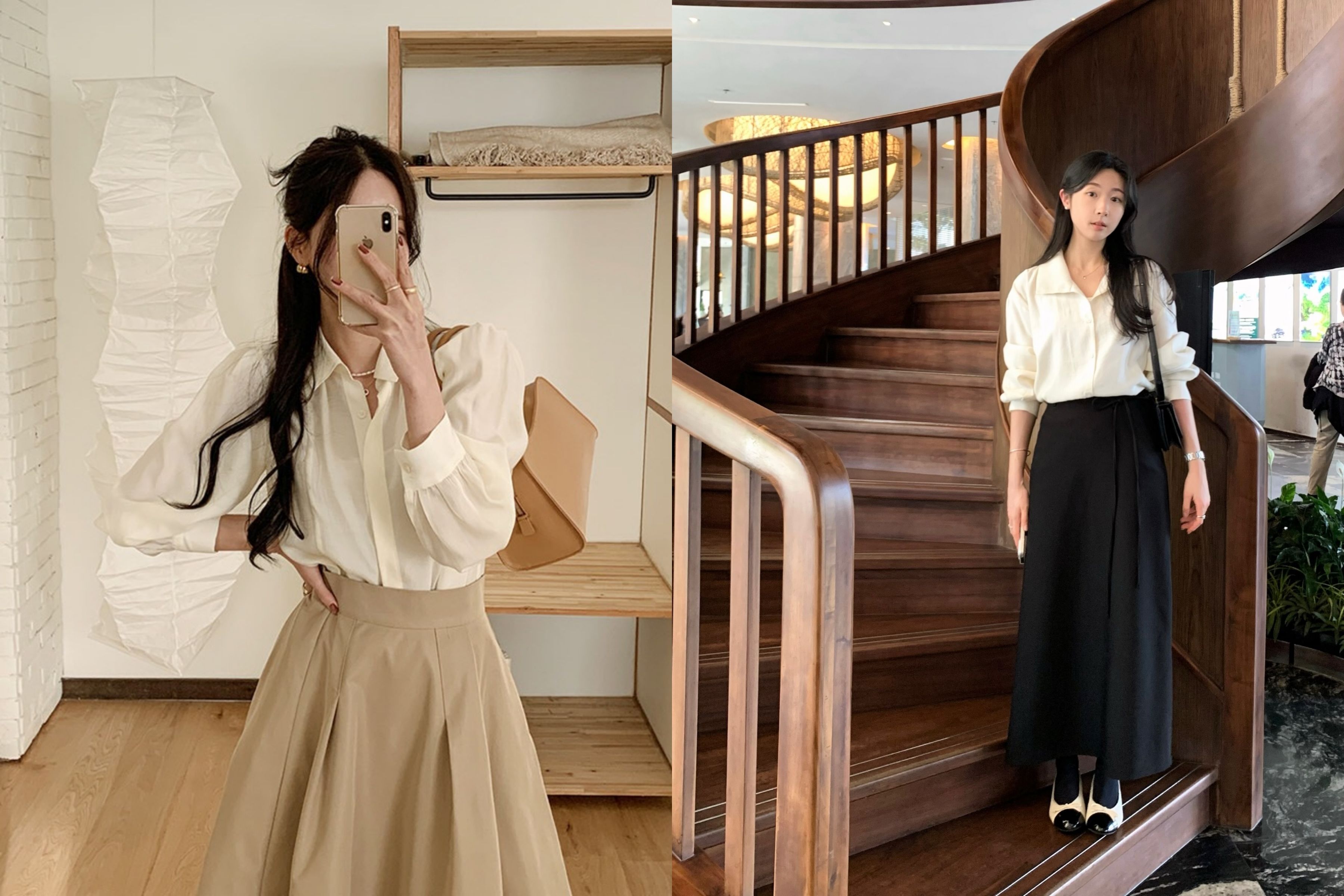 Để phá vỡ sự cứng nhắc thường ngày, hãy thử nghiệm nghệ thuật phối khối (Proportion play). Sơ mi lụa Oversized (dáng rộng) buông lơi nửa vạt (Half-tuck) trên nền Chân váy xếp ly (Pleated Skirt) bay bổng.