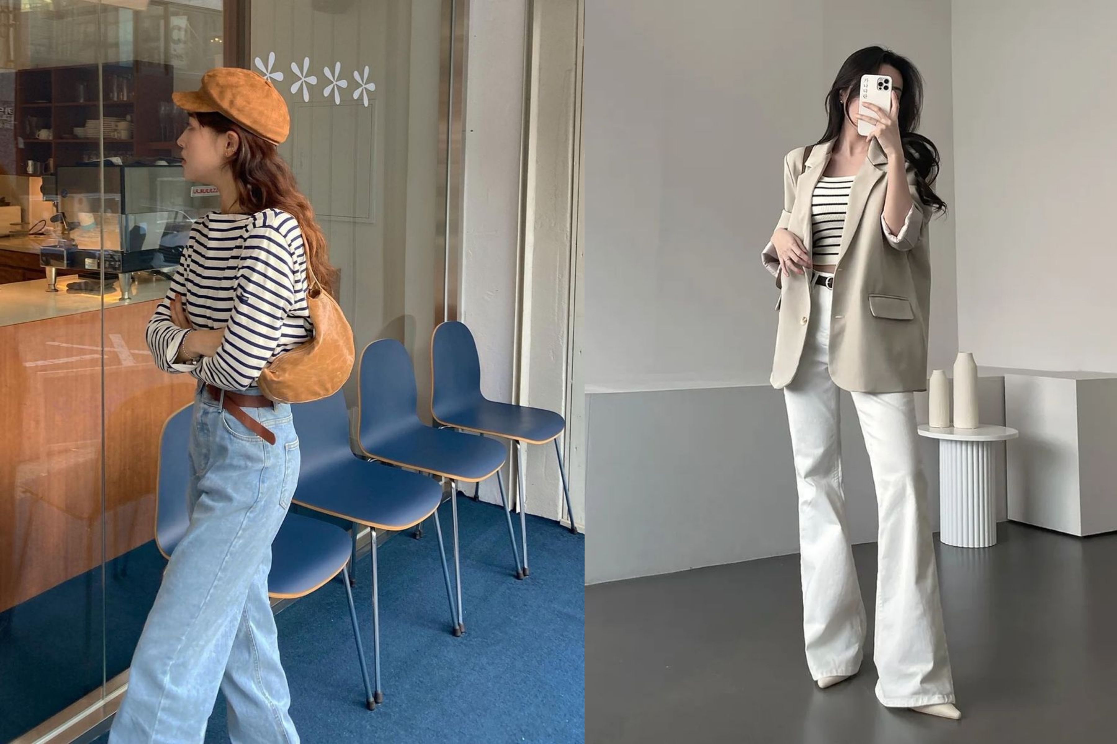Sự trẻ trung đôi khi đến từ những gì kinh điển nhất. Áo kẻ sọc Breton luôn là biểu tượng của sự tươi sáng và thanh lịch. Khi được kết hợp cùng sự phóng khoáng của quần ống rộng cạp cao, hiệu ứng trẻ hóa càng trở nên rõ rệt. Bản phối này không chỉ mang lại sự thoải mái tối đa mà còn toát lên vẻ tinh tế, đậm chất Paris. Chỉ cần một đôi sandal tối giản và một chiếc túi cói, bạn đã sẵn sàng cho một ngày dạo phố đầy phong cách.