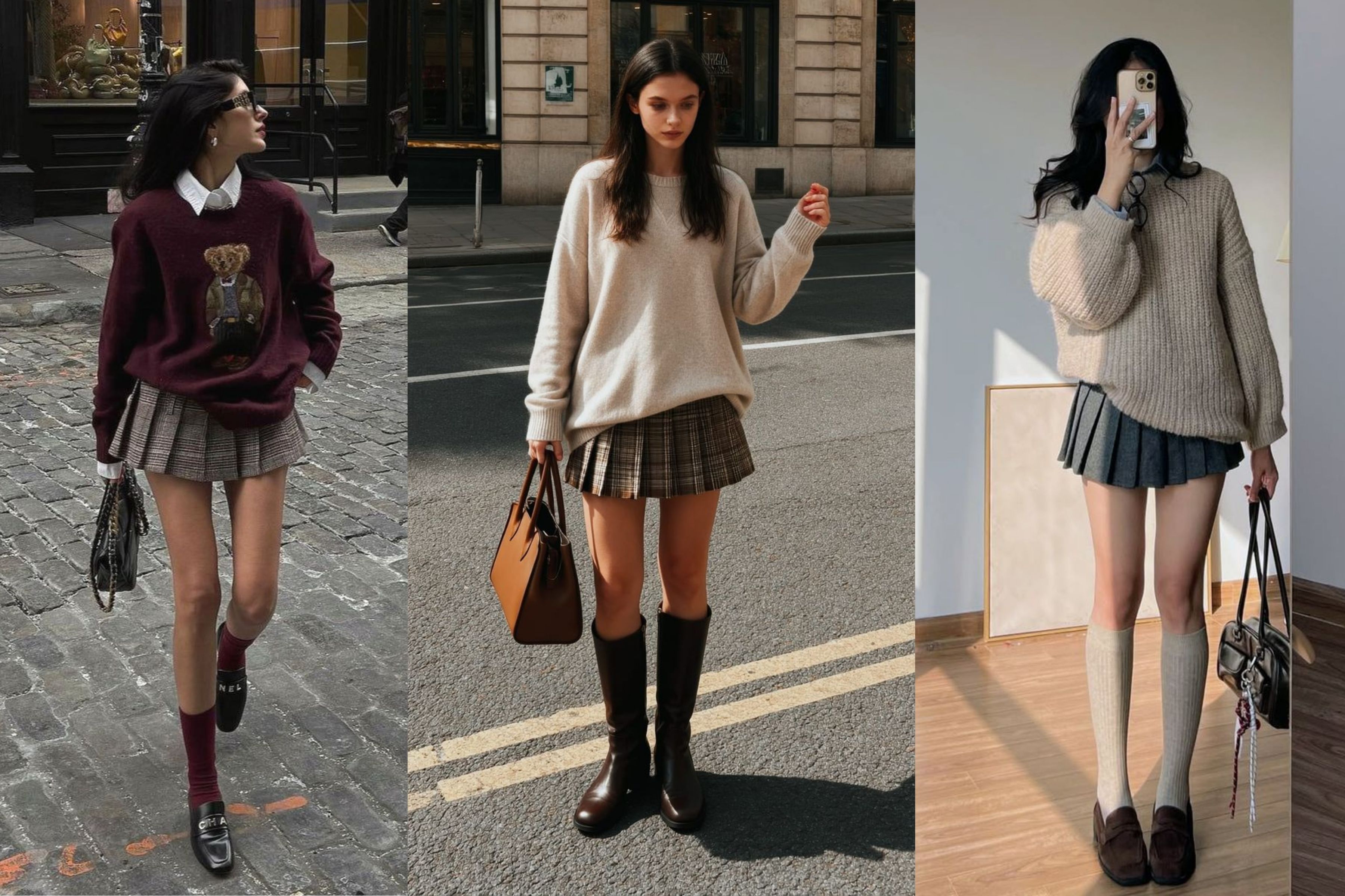 Công thức này là bản giao hưởng của sự mềm mại và nét năng động. Một chiếc áo len cashmere ấm áp, kết hợp cùng chân váy chữ A ngắn trên gối tạo nên một tỷ lệ cơ thể hoàn hảo, giúp "hack" chiều dài đôi chân một cách hiệu quả. Để vẻ ngoài thêm phần sang trọng, hãy chọn một chiếc áo len cổ lọ dệt mịn và chân váy tweed. Hoàn thiện set đồ bằng một đôi boots cổ ngắn – bạn đã có ngay một diện mạo ngọt ngào, thời thượng đúng chuẩn phong cách preppy hiện đại.