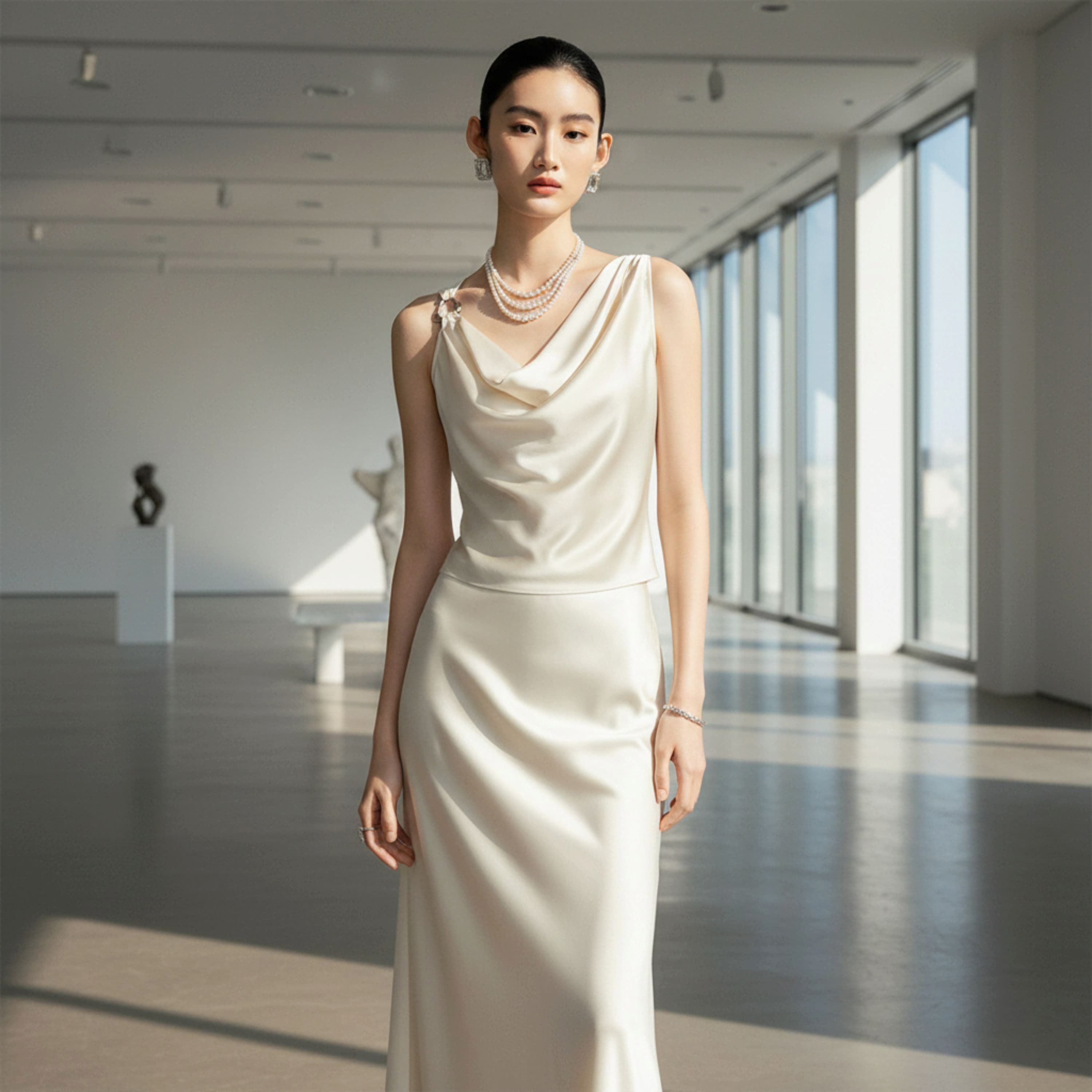 Trái tim của thiết kế nằm ở chiếc áo hai dây với kỹ thuật cổ đổ (cowl neckline) kinh điển. Không tuân theo những đường cắt may thông thường, các nhà thiết kế đã để cho tấm lụa satin tự do "tuôn chảy", tạo nên những nếp gấp mềm mại, tự nhiên như một dòng thác. Theo các biên tập viên của Vogue, đây là một trong những kỹ thuật khó nhất, đòi hỏi sự thấu hiểu sâu sắc về chất liệu. Để cân bằng sự lãng mạn đó, một chi tiết khoen kim loại (hardware detail) được thêm vào nơi quai áo như một tuyên ngôn về sự đương đại. Đây là một thiết kế độc lập, đầy khí chất, có thể dễ dàng phối đồ với quần âu hay chân váy khác để tạo nên một bản phối hoàn toàn mới.