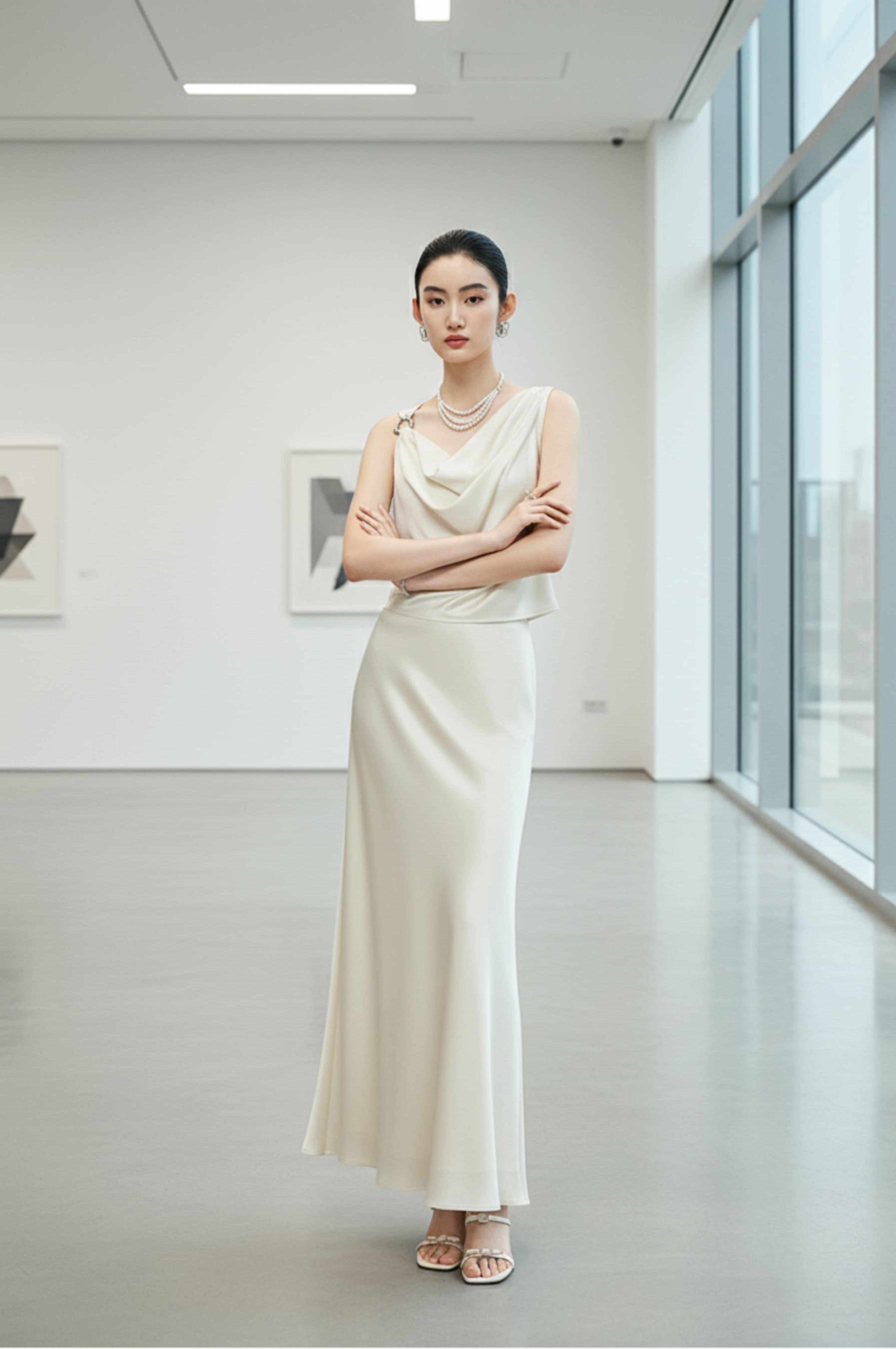 "Aura Set" là một bản giao hưởng của sự mềm mại và cá tính, một cuộc đối thoại đầy duy mỹ giữa hai mảnh ghép hoàn hảo: áo cổ đổ và chân váy lụa dài. Đây là câu trả lời cho câu hỏi mặc gì đi tiệc sang trọng mà vẫn thể hiện được cá tính riêng.
