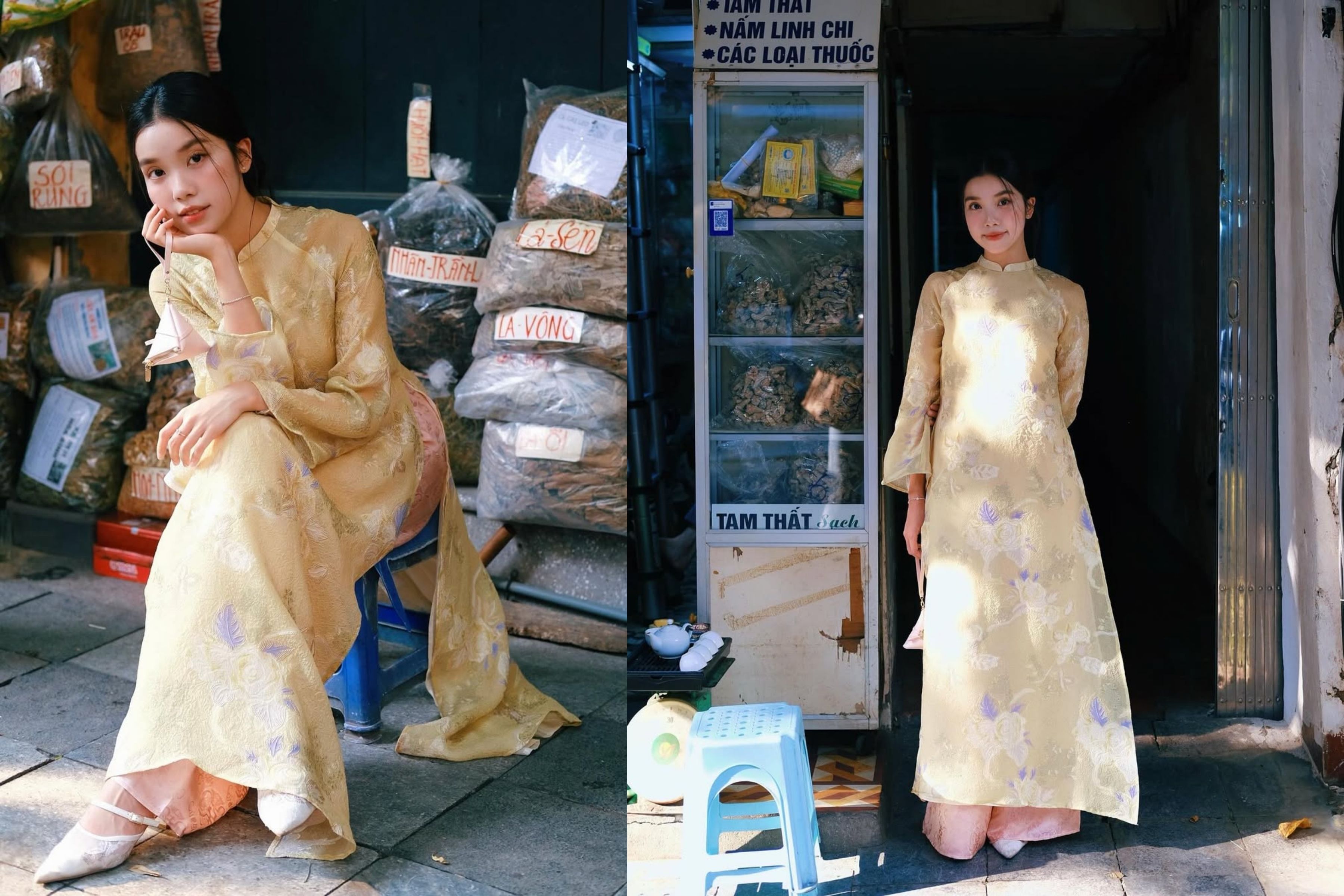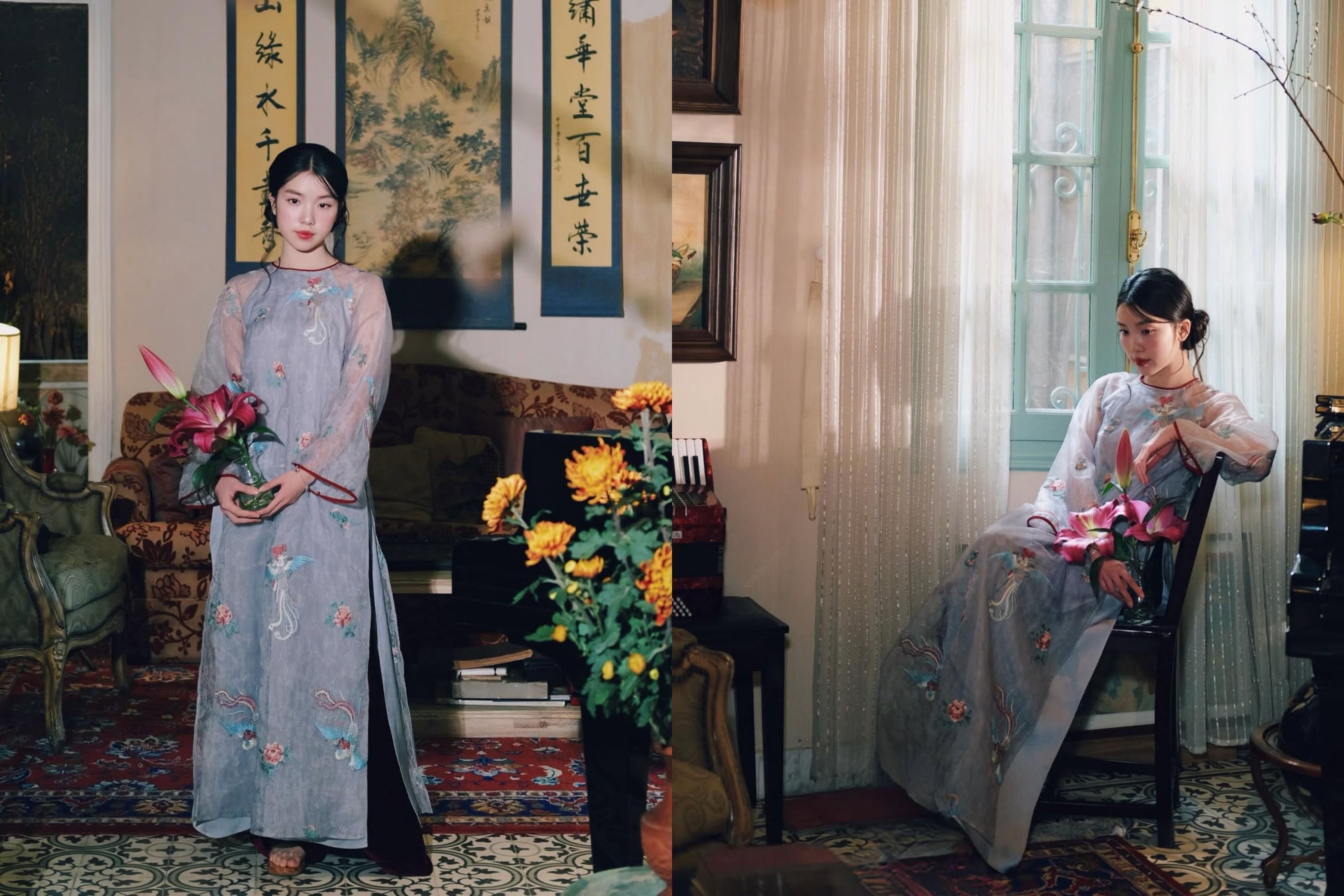 Sự sang trọng ở đây đến từ sự tối giản: một chiếc áo dài lụa trơn bóng, đường may chuẩn xác ôm lấy đường cong cơ thể, kết hợp cùng phụ kiện ngọc trai. Đó là vẻ đẹp của sự hoài niệm nhưng được làm mới bởi tư duy thời trang hiện đại.