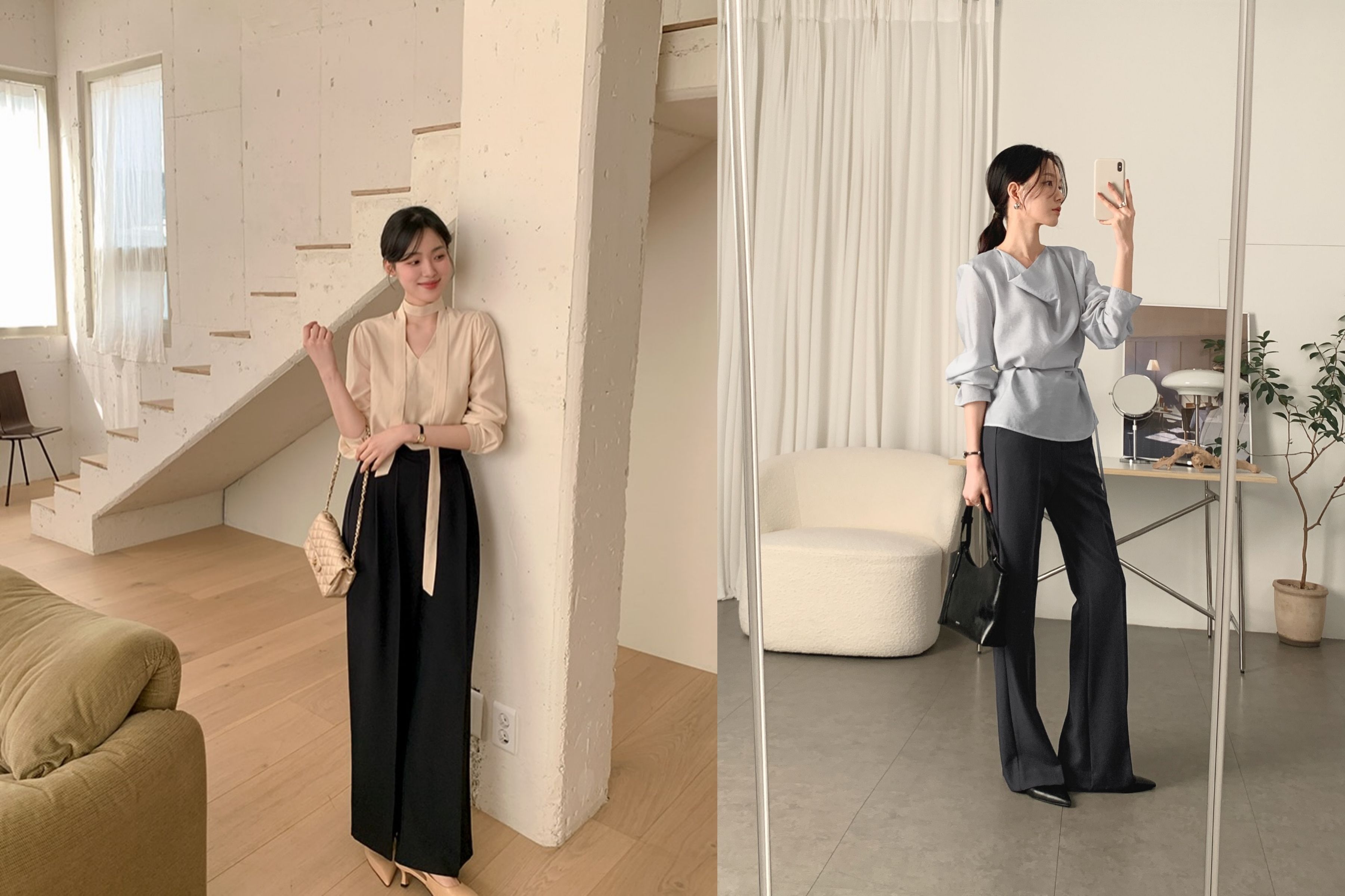 Quần âu đen với những đường cắt may sắc sảo là nửa kia hoàn hảo của chiếc Áo Blouse Lụa (Silk Blouse) óng ả. Sự đối lập giữa chất liệu vải Tuytsi đứng phom và lụa tơ tằm mềm mại tạo nên chiều sâu cho trang phục.
