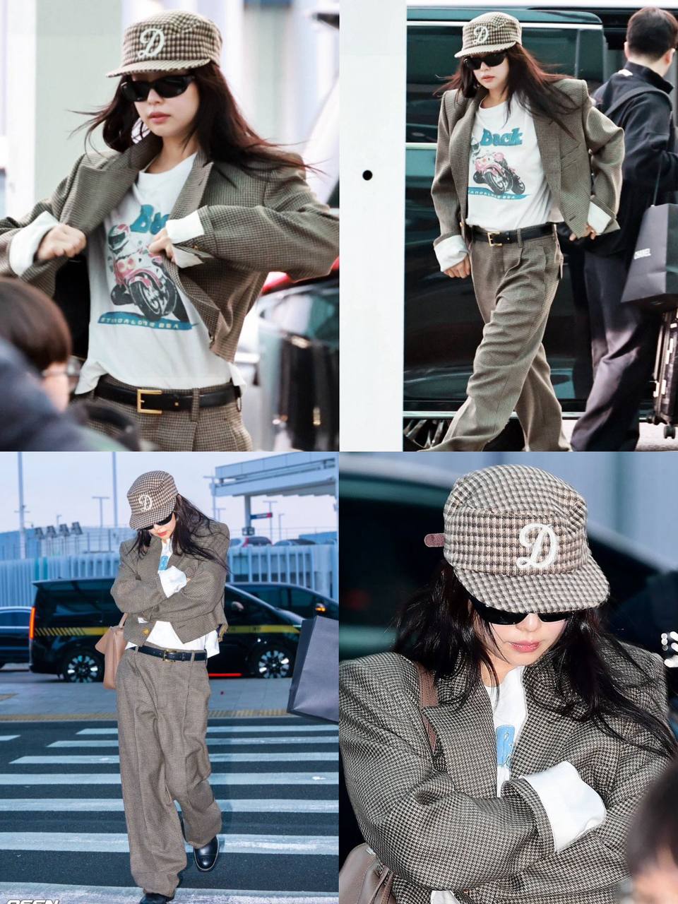 Sự xuất hiện của Jennie tại sân bay là một bản phối hoàn hảo của nghệ thuật "High-Low Dressing" (Kết hợp đồ xa xỉ và bình dân). Cô khéo léo kết hợp chiếc túi Chanel đắt giá cùng chiếc mũ Pillbox Cap Check Brown mang hơi hướng Vintage từ DEF.