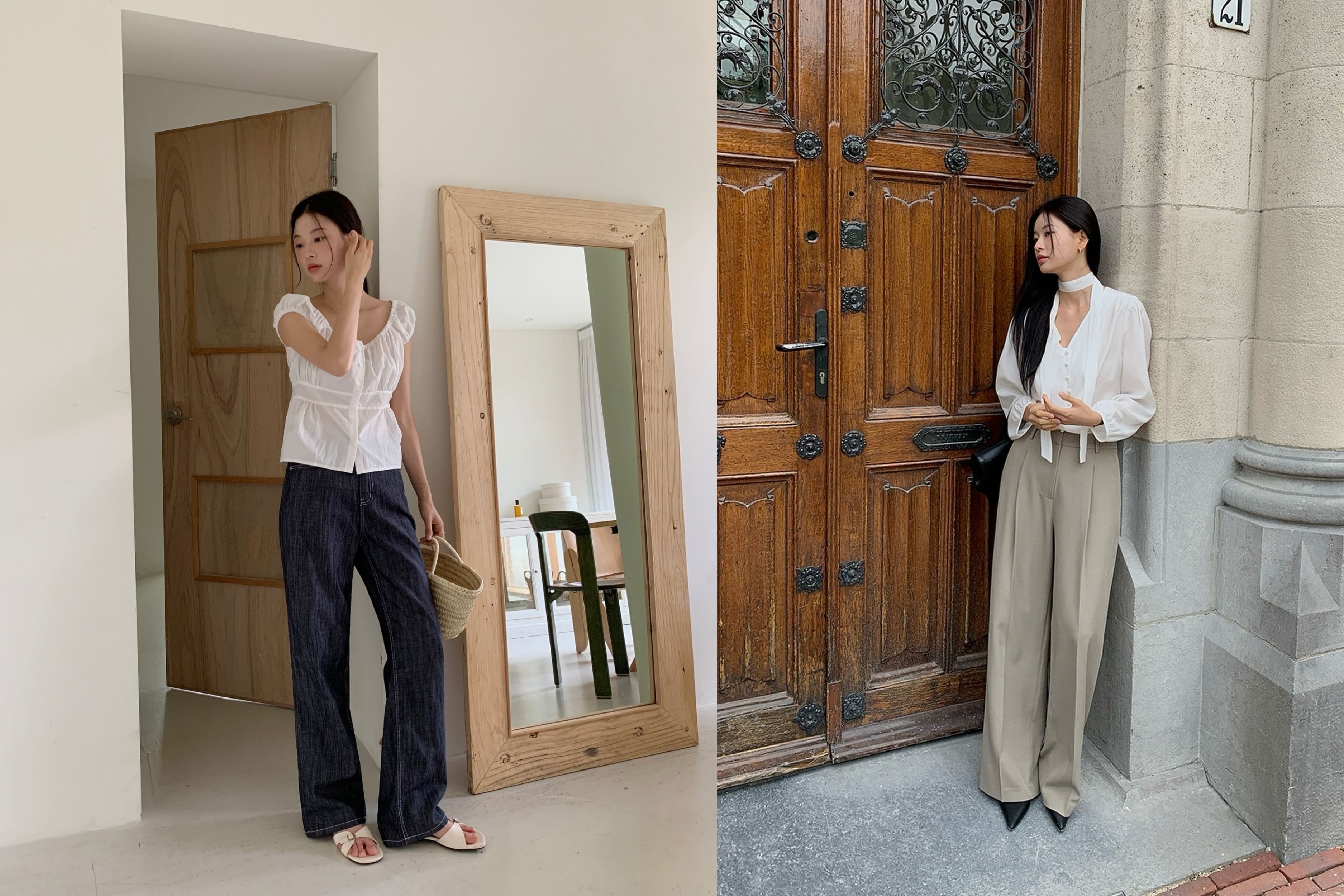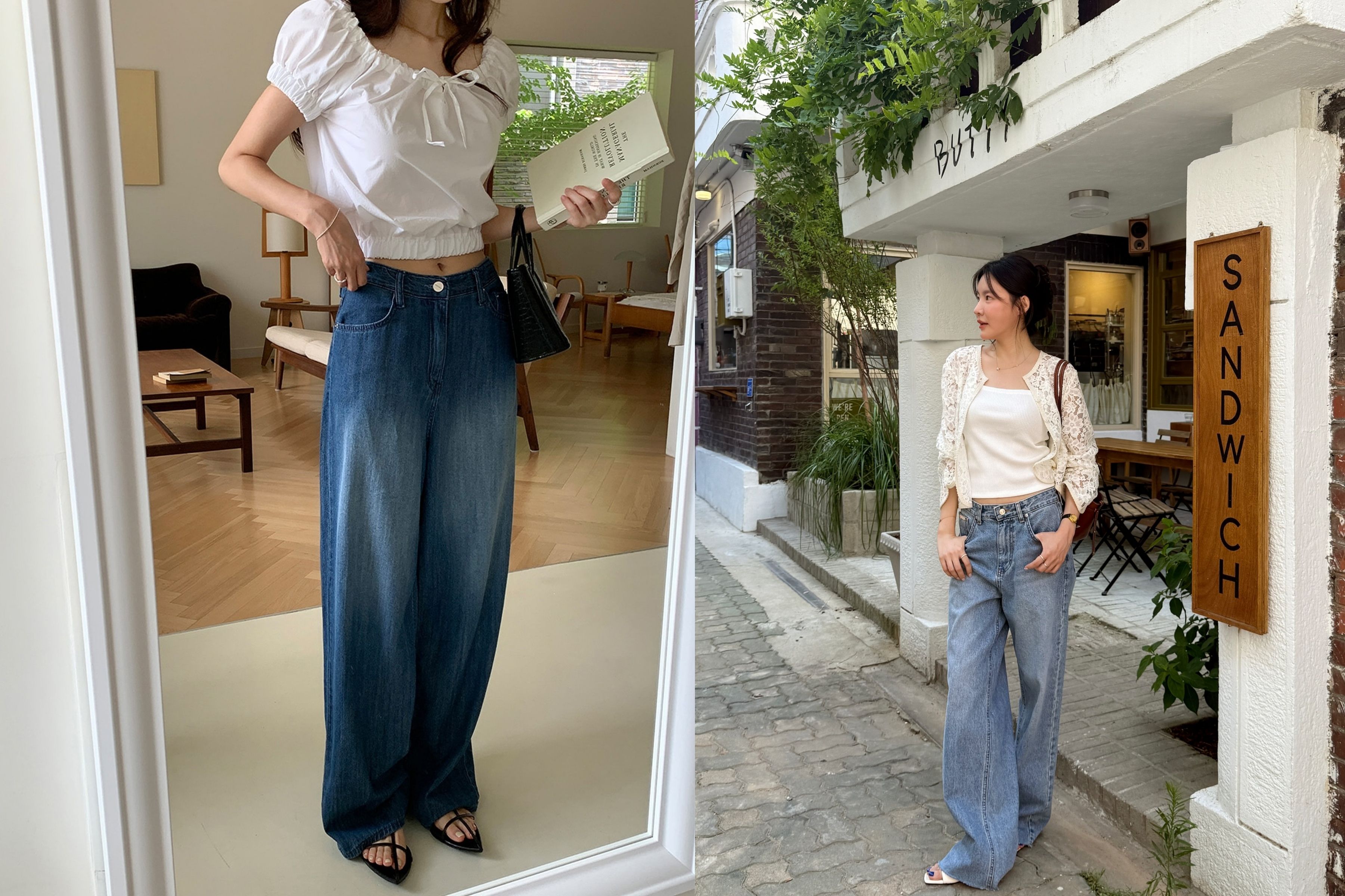 Sự kết hợp giữa Sơ mi trắng (White Shirt) và Quần Jeans ống suông (Wide-leg Denim) là đỉnh cao của phong cách "Effortless Chic" (Đẹp không gắng gượng).